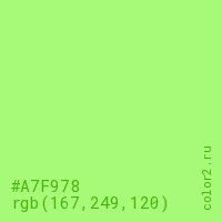 Цвет RGB(167, 249, 120) в процентом отношении количества цвета состоит из 65.5% красного (red), 97.6% зелёного (green) и 47.1% синего (blue).