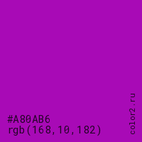 Цвет #A80AB6 в цветовой модели RGB обозначается тремя октетами (168, 10, 182) в десятичном формате и #A80AB6 в шестнадцатиричном (hex) формате, которые являются интенсивностью красного 168 (hex A8), интенсивность зелёного 10 (hex 0A) и интенсивность синего 182 (hex B6).