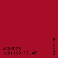 Цвет #A80D28 в цветовой модели RGB обозначается тремя октетами (168, 13, 40) в десятичном формате и #A80D28 в шестнадцатиричном (hex) формате, которые являются интенсивностью красного 168 (hex A8), интенсивность зелёного 13 (hex 0D) и интенсивность синего 40 (hex 28).