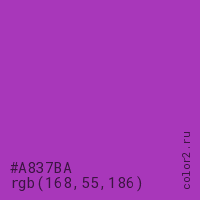 Цвет #A837BA в цветовой модели RGB обозначается тремя октетами (168, 55, 186) в десятичном формате и #A837BA в шестнадцатиричном (hex) формате, которые являются интенсивностью красного 168 (hex A8), интенсивность зелёного 55 (hex 37) и интенсивность синего 186 (hex BA).