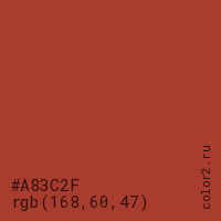 Цвет #A83C2F в цветовой модели RGB обозначается тремя октетами (168, 60, 47) в десятичном формате и #A83C2F в шестнадцатиричном (hex) формате, которые являются интенсивностью красного 168 (hex A8), интенсивность зелёного 60 (hex 3C) и интенсивность синего 47 (hex 2F).