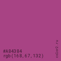 Цвет #A84384 в цветовой модели RGB обозначается тремя октетами (168, 67, 132) в десятичном формате и #A84384 в шестнадцатиричном (hex) формате, которые являются интенсивностью красного 168 (hex A8), интенсивность зелёного 67 (hex 43) и интенсивность синего 132 (hex 84).