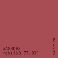 Цвет #A84D53 в цветовой модели RGB обозначается тремя октетами (168, 77, 83) в десятичном формате и #A84D53 в шестнадцатиричном (hex) формате, которые являются интенсивностью красного 168 (hex A8), интенсивность зелёного 77 (hex 4D) и интенсивность синего 83 (hex 53).