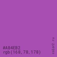 Цвет #A84EB2 в цветовой модели RGB обозначается тремя октетами (168, 78, 178) в десятичном формате и #A84EB2 в шестнадцатиричном (hex) формате, которые являются интенсивностью красного 168 (hex A8), интенсивность зелёного 78 (hex 4E) и интенсивность синего 178 (hex B2).