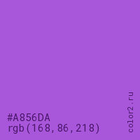 Цвет #A856DA в цветовой модели RGB обозначается тремя октетами (168, 86, 218) в десятичном формате и #A856DA в шестнадцатиричном (hex) формате, которые являются интенсивностью красного 168 (hex A8), интенсивность зелёного 86 (hex 56) и интенсивность синего 218 (hex DA).
