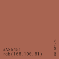 Цвет #A86451 в цветовой модели RGB обозначается тремя октетами (168, 100, 81) в десятичном формате и #A86451 в шестнадцатиричном (hex) формате, которые являются интенсивностью красного 168 (hex A8), интенсивность зелёного 100 (hex 64) и интенсивность синего 81 (hex 51).