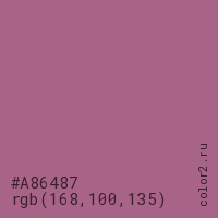 Цвет #A86487 в цветовой модели RGB обозначается тремя октетами (168, 100, 135) в десятичном формате и #A86487 в шестнадцатиричном (hex) формате, которые являются интенсивностью красного 168 (hex A8), интенсивность зелёного 100 (hex 64) и интенсивность синего 135 (hex 87).