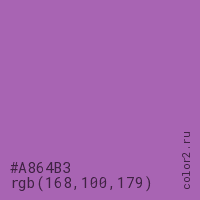 Цвет #A864B3 в цветовой модели RGB обозначается тремя октетами (168, 100, 179) в десятичном формате и #A864B3 в шестнадцатиричном (hex) формате, которые являются интенсивностью красного 168 (hex A8), интенсивность зелёного 100 (hex 64) и интенсивность синего 179 (hex B3).