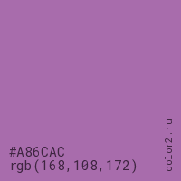 Цвет #A86CAC в цветовой модели RGB обозначается тремя октетами (168, 108, 172) в десятичном формате и #A86CAC в шестнадцатиричном (hex) формате, которые являются интенсивностью красного 168 (hex A8), интенсивность зелёного 108 (hex 6C) и интенсивность синего 172 (hex AC).
