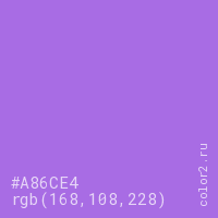 Цвет #A86CE4 в цветовой модели RGB обозначается тремя октетами (168, 108, 228) в десятичном формате и #A86CE4 в шестнадцатиричном (hex) формате, которые являются интенсивностью красного 168 (hex A8), интенсивность зелёного 108 (hex 6C) и интенсивность синего 228 (hex E4).