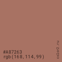 Цвет #A87263 в цветовой модели RGB обозначается тремя октетами (168, 114, 99) в десятичном формате и #A87263 в шестнадцатиричном (hex) формате, которые являются интенсивностью красного 168 (hex A8), интенсивность зелёного 114 (hex 72) и интенсивность синего 99 (hex 63).