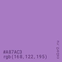 Цвет #A87AC3 в цветовой модели RGB обозначается тремя октетами (168, 122, 195) в десятичном формате и #A87AC3 в шестнадцатиричном (hex) формате, которые являются интенсивностью красного 168 (hex A8), интенсивность зелёного 122 (hex 7A) и интенсивность синего 195 (hex C3).