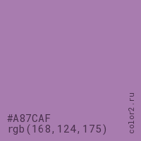 Цвет #A87CAF в цветовой модели RGB обозначается тремя октетами (168, 124, 175) в десятичном формате и #A87CAF в шестнадцатиричном (hex) формате, которые являются интенсивностью красного 168 (hex A8), интенсивность зелёного 124 (hex 7C) и интенсивность синего 175 (hex AF).