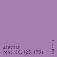 Цвет #A87DAF в цветовой модели RGB обозначается тремя октетами (168, 125, 175) в десятичном формате и #A87DAF в шестнадцатиричном (hex) формате, которые являются интенсивностью красного 168 (hex A8), интенсивность зелёного 125 (hex 7D) и интенсивность синего 175 (hex AF).