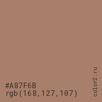 Цвет #A87F6B в цветовой модели RGB обозначается тремя октетами (168, 127, 107) в десятичном формате и #A87F6B в шестнадцатиричном (hex) формате, которые являются интенсивностью красного 168 (hex A8), интенсивность зелёного 127 (hex 7F) и интенсивность синего 107 (hex 6B).