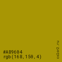 Цвет #A89604 в цветовой модели RGB обозначается тремя октетами (168, 150, 4) в десятичном формате и #A89604 в шестнадцатиричном (hex) формате, которые являются интенсивностью красного 168 (hex A8), интенсивность зелёного 150 (hex 96) и интенсивность синего 4 (hex 04).