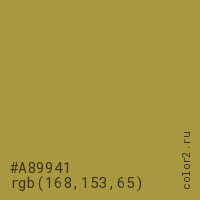 Цвет #A89941 в цветовой модели RGB обозначается тремя октетами (168, 153, 65) в десятичном формате и #A89941 в шестнадцатиричном (hex) формате, которые являются интенсивностью красного 168 (hex A8), интенсивность зелёного 153 (hex 99) и интенсивность синего 65 (hex 41).