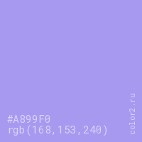 Цвет #A899F0 в цветовой модели RGB обозначается тремя октетами (168, 153, 240) в десятичном формате и #A899F0 в шестнадцатиричном (hex) формате, которые являются интенсивностью красного 168 (hex A8), интенсивность зелёного 153 (hex 99) и интенсивность синего 240 (hex F0).