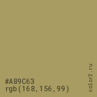 Цвет #A89C63 в цветовой модели RGB обозначается тремя октетами (168, 156, 99) в десятичном формате и #A89C63 в шестнадцатиричном (hex) формате, которые являются интенсивностью красного 168 (hex A8), интенсивность зелёного 156 (hex 9C) и интенсивность синего 99 (hex 63).