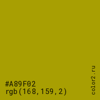Цвет #A89F02 в цветовой модели RGB обозначается тремя октетами (168, 159, 2) в десятичном формате и #A89F02 в шестнадцатиричном (hex) формате, которые являются интенсивностью красного 168 (hex A8), интенсивность зелёного 159 (hex 9F) и интенсивность синего 2 (hex 02).