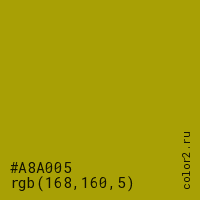Цвет #A8A005 в цветовой модели RGB обозначается тремя октетами (168, 160, 5) в десятичном формате и #A8A005 в шестнадцатиричном (hex) формате, которые являются интенсивностью красного 168 (hex A8), интенсивность зелёного 160 (hex A0) и интенсивность синего 5 (hex 05).