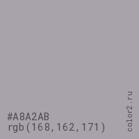Цвет #A8A2AB в цветовой модели RGB обозначается тремя октетами (168, 162, 171) в десятичном формате и #A8A2AB в шестнадцатиричном (hex) формате, которые являются интенсивностью красного 168 (hex A8), интенсивность зелёного 162 (hex A2) и интенсивность синего 171 (hex AB).