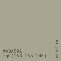 Цвет #A8A592 в цветовой модели RGB обозначается тремя октетами (168, 165, 146) в десятичном формате и #A8A592 в шестнадцатиричном (hex) формате, которые являются интенсивностью красного 168 (hex A8), интенсивность зелёного 165 (hex A5) и интенсивность синего 146 (hex 92).