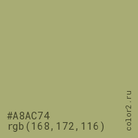 Цвет #A8AC74 в цветовой модели RGB обозначается тремя октетами (168, 172, 116) в десятичном формате и #A8AC74 в шестнадцатиричном (hex) формате, которые являются интенсивностью красного 168 (hex A8), интенсивность зелёного 172 (hex AC) и интенсивность синего 116 (hex 74).