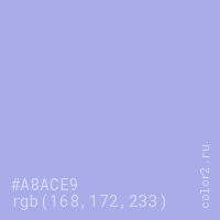 Цвет #A8ACE9 в цветовой модели RGB обозначается тремя октетами (168, 172, 233) в десятичном формате и #A8ACE9 в шестнадцатиричном (hex) формате, которые являются интенсивностью красного 168 (hex A8), интенсивность зелёного 172 (hex AC) и интенсивность синего 233 (hex E9).