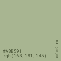 Цвет #A8B591 в цветовой модели RGB обозначается тремя октетами (168, 181, 145) в десятичном формате и #A8B591 в шестнадцатиричном (hex) формате, которые являются интенсивностью красного 168 (hex A8), интенсивность зелёного 181 (hex B5) и интенсивность синего 145 (hex 91).