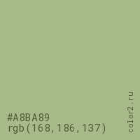 Цвет #A8BA89 в цветовой модели RGB обозначается тремя октетами (168, 186, 137) в десятичном формате и #A8BA89 в шестнадцатиричном (hex) формате, которые являются интенсивностью красного 168 (hex A8), интенсивность зелёного 186 (hex BA) и интенсивность синего 137 (hex 89).