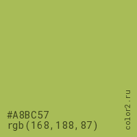 Цвет #A8BC57 в цветовой модели RGB обозначается тремя октетами (168, 188, 87) в десятичном формате и #A8BC57 в шестнадцатиричном (hex) формате, которые являются интенсивностью красного 168 (hex A8), интенсивность зелёного 188 (hex BC) и интенсивность синего 87 (hex 57).