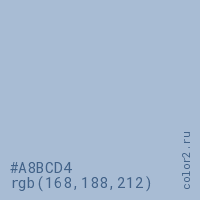 Цвет #A8BCD4 в цветовой модели RGB обозначается тремя октетами (168, 188, 212) в десятичном формате и #A8BCD4 в шестнадцатиричном (hex) формате, которые являются интенсивностью красного 168 (hex A8), интенсивность зелёного 188 (hex BC) и интенсивность синего 212 (hex D4).