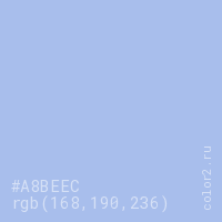 Цвет #A8BEEC в цветовой модели RGB обозначается тремя октетами (168, 190, 236) в десятичном формате и #A8BEEC в шестнадцатиричном (hex) формате, которые являются интенсивностью красного 168 (hex A8), интенсивность зелёного 190 (hex BE) и интенсивность синего 236 (hex EC).