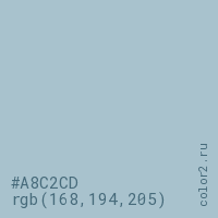 Цвет #A8C2CD в цветовой модели RGB обозначается тремя октетами (168, 194, 205) в десятичном формате и #A8C2CD в шестнадцатиричном (hex) формате, которые являются интенсивностью красного 168 (hex A8), интенсивность зелёного 194 (hex C2) и интенсивность синего 205 (hex CD).