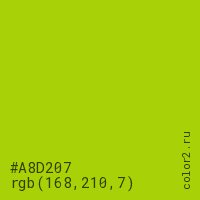 Цвет #A8D207 в цветовой модели RGB обозначается тремя октетами (168, 210, 7) в десятичном формате и #A8D207 в шестнадцатиричном (hex) формате, которые являются интенсивностью красного 168 (hex A8), интенсивность зелёного 210 (hex D2) и интенсивность синего 7 (hex 07).