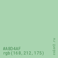 Цвет #A8D4AF в цветовой модели RGB обозначается тремя октетами (168, 212, 175) в десятичном формате и #A8D4AF в шестнадцатиричном (hex) формате, которые являются интенсивностью красного 168 (hex A8), интенсивность зелёного 212 (hex D4) и интенсивность синего 175 (hex AF).