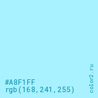 Цвет #A8F1FF в цветовой модели RGB обозначается тремя октетами (168, 241, 255) в десятичном формате и #A8F1FF в шестнадцатиричном (hex) формате, которые являются интенсивностью красного 168 (hex A8), интенсивность зелёного 241 (hex F1) и интенсивность синего 255 (hex FF).