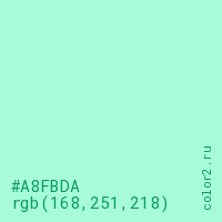 Цвет #A8FBDA в цветовой модели RGB обозначается тремя октетами (168, 251, 218) в десятичном формате и #A8FBDA в шестнадцатиричном (hex) формате, которые являются интенсивностью красного 168 (hex A8), интенсивность зелёного 251 (hex FB) и интенсивность синего 218 (hex DA).