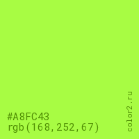 Цвет #A8FC43 в цветовой модели RGB обозначается тремя октетами (168, 252, 67) в десятичном формате и #A8FC43 в шестнадцатиричном (hex) формате, которые являются интенсивностью красного 168 (hex A8), интенсивность зелёного 252 (hex FC) и интенсивность синего 67 (hex 43).