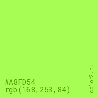 Цвет RGB(168, 253, 84) в процентом отношении количества цвета состоит из 65.9% красного (red), 99.2% зелёного (green) и 32.9% синего (blue).