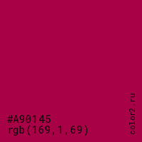 Цвет #A90145 в цветовой модели RGB обозначается тремя октетами (169, 1, 69) в десятичном формате и #A90145 в шестнадцатиричном (hex) формате, которые являются интенсивностью красного 169 (hex A9), интенсивность зелёного 1 (hex 01) и интенсивность синего 69 (hex 45).