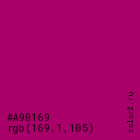 Цвет #A90169 в цветовой модели RGB обозначается тремя октетами (169, 1, 105) в десятичном формате и #A90169 в шестнадцатиричном (hex) формате, которые являются интенсивностью красного 169 (hex A9), интенсивность зелёного 1 (hex 01) и интенсивность синего 105 (hex 69).