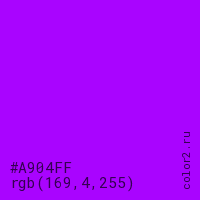 Цвет #A904FF в цветовой модели RGB обозначается тремя октетами (169, 4, 255) в десятичном формате и #A904FF в шестнадцатиричном (hex) формате, которые являются интенсивностью красного 169 (hex A9), интенсивность зелёного 4 (hex 04) и интенсивность синего 255 (hex FF).