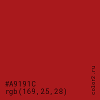 Цвет #A9191C в цветовой модели RGB обозначается тремя октетами (169, 25, 28) в десятичном формате и #A9191C в шестнадцатиричном (hex) формате, которые являются интенсивностью красного 169 (hex A9), интенсивность зелёного 25 (hex 19) и интенсивность синего 28 (hex 1C).