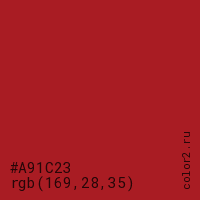 Цвет #A91C23 в цветовой модели RGB обозначается тремя октетами (169, 28, 35) в десятичном формате и #A91C23 в шестнадцатиричном (hex) формате, которые являются интенсивностью красного 169 (hex A9), интенсивность зелёного 28 (hex 1C) и интенсивность синего 35 (hex 23).