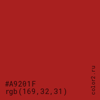 Цвет #A9201F в цветовой модели RGB обозначается тремя октетами (169, 32, 31) в десятичном формате и #A9201F в шестнадцатиричном (hex) формате, которые являются интенсивностью красного 169 (hex A9), интенсивность зелёного 32 (hex 20) и интенсивность синего 31 (hex 1F).