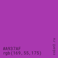 Цвет #A937AF в цветовой модели RGB обозначается тремя октетами (169, 55, 175) в десятичном формате и #A937AF в шестнадцатиричном (hex) формате, которые являются интенсивностью красного 169 (hex A9), интенсивность зелёного 55 (hex 37) и интенсивность синего 175 (hex AF).
