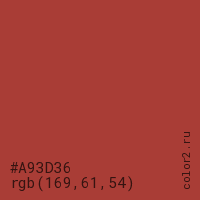 Цвет #A93D36 в цветовой модели RGB обозначается тремя октетами (169, 61, 54) в десятичном формате и #A93D36 в шестнадцатиричном (hex) формате, которые являются интенсивностью красного 169 (hex A9), интенсивность зелёного 61 (hex 3D) и интенсивность синего 54 (hex 36).
