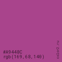 Цвет #A9448C в цветовой модели RGB обозначается тремя октетами (169, 68, 140) в десятичном формате и #A9448C в шестнадцатиричном (hex) формате, которые являются интенсивностью красного 169 (hex A9), интенсивность зелёного 68 (hex 44) и интенсивность синего 140 (hex 8C).